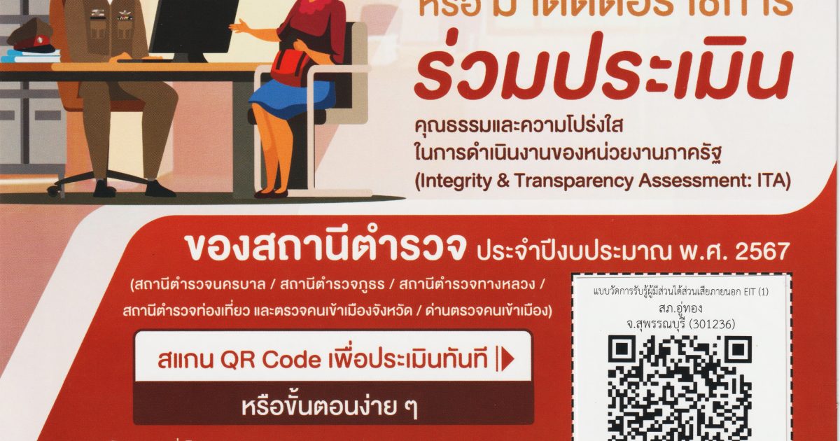 ขอเชิญผู้มารับบริการหรือมาติดต่อราชการร่วมประเมินคุณธรรมและความโปร่งใสในการดำเนินงานของหน่วยงานภาครัฐ (Integrity and Transparency Assessment : ITA) ประจำปีงบประมาณ พ.ศ. 2567