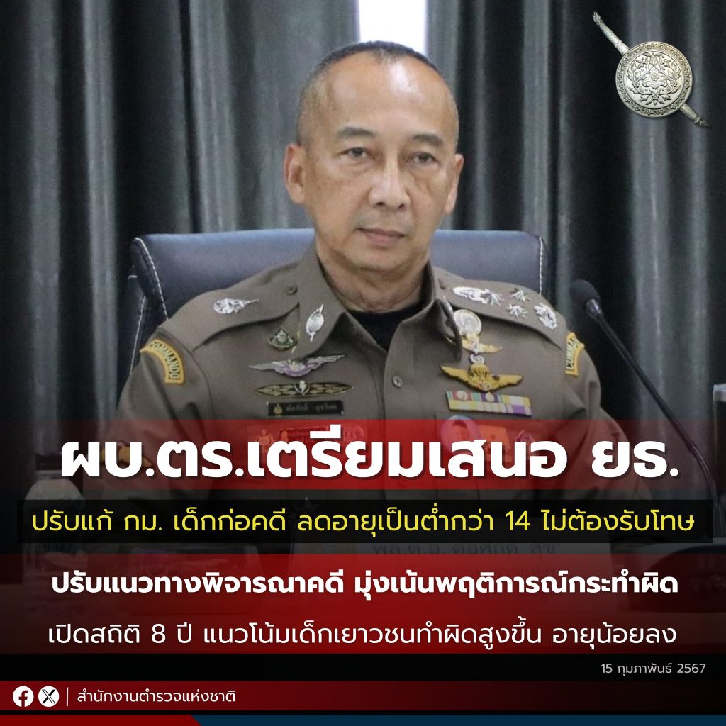 ผบ.ตร.รับรายงานผลการศึกษาอายุการกระทำผิดเด็กเยาวชน พบแนวโน้มทำผิดสูงขึ้น เกณฑ์อายุที่ทำผิดต่ำลง เตรียมเสนอกระทรวงยุติธรรม ปรับแก้ไขกฎหมายกำหนดโทษคดีเด็กไม่ต้องรับโทษ จากอายุไม่เกิน 15 ปี เป็น 14 ปี รวมทั้งแนวทางพิจารณาคดี ให้มุ่งเน้นพฤติการณ์กระทำผิดมากขึ้น เพื่อให้สอดคล้องบริบทสังคม คุ้มครองความปลอดภัยประชาชนส่วนรวม