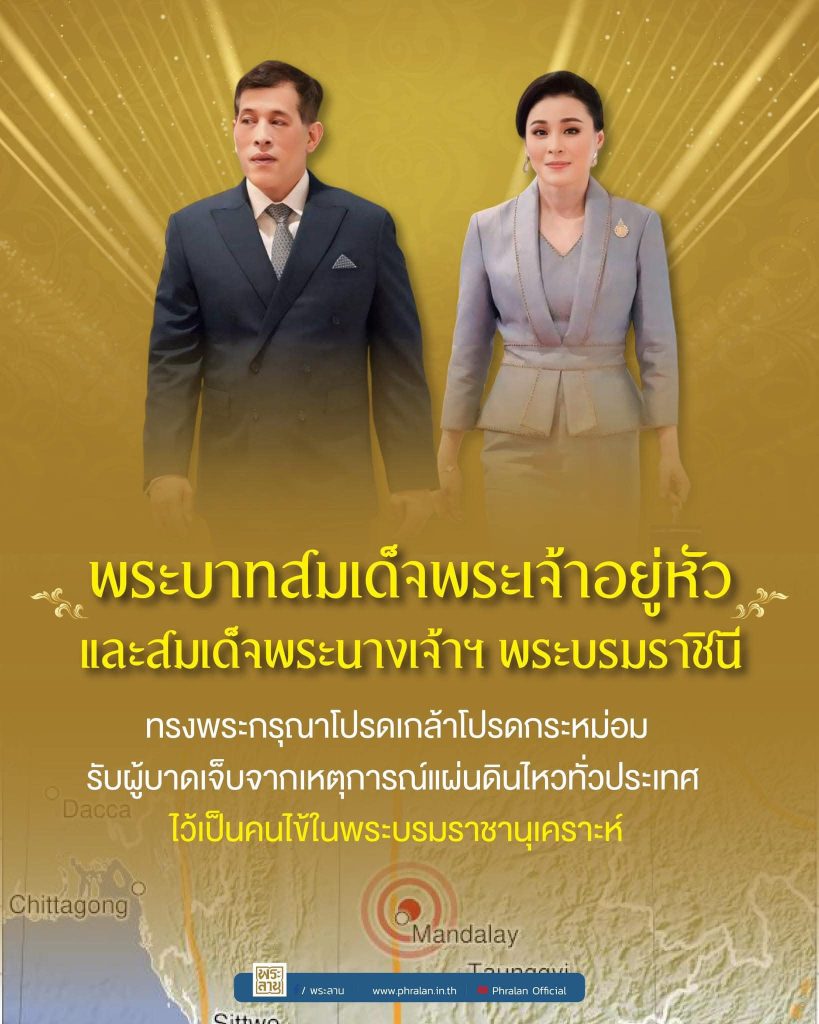 พระบาทสมเด็จพระเจ้าอยู่หัว สมเด็จพระนางเจ้าฯ พระบรมราชินี และสมเด็จพระเจ้าลูกยาเธอ เจ้าฟ้าทีปังกรรัศมีโชติฯ ทรงเสียพระราชหฤทัย กับครอบครัวผู้เสียชีวิต และทรงห่วงใยผู้ที่ได้รับบาดเจ็บ จากเหตุการณ์แผ่นดินไหวเมื่อวันที่ ๒๘ มีนาคม ที่ผ่านมา