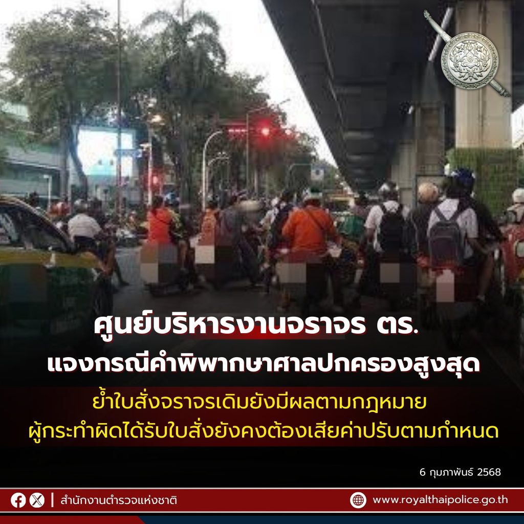ศูนย์บริหารงานจราจร สำนักงานตำรวจแห่งชาติ ย้ำใบสั่งจราจรเดิมยังมีผลตามกฎหมาย ผู้กระทำผิดได้รับใบสั่งยังคงต้องเสียค่าปรับตามกำหนด