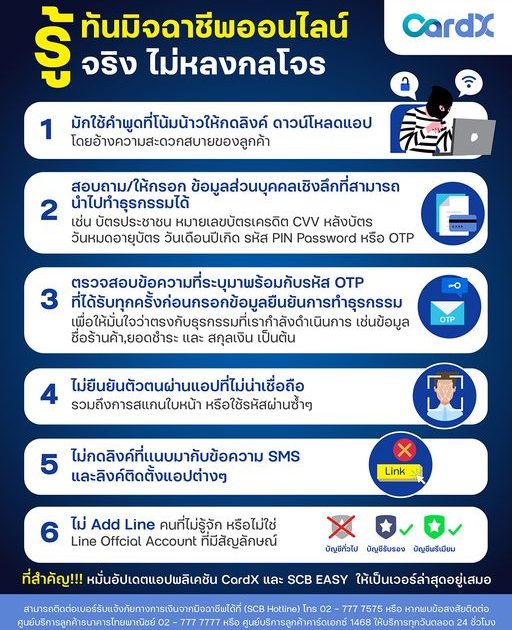 หากกังวลใจเรื่องมิจฉาชีพออนไลน์ ติดต่อเบอร์รับแจ้งภัยทางการเงินจากมิจฉาชีพ (SCB Hotline) โทร 02 – 777 7575 หรือ หากพบข้อสงสัยติดต่อ ศูนย์บริการลูกค้าธนาคารไทยพาณิชย์ 02 – 777 7777 หรือ ศูนย์บริการลูกค้าคาร์ดเอกซ์ 1468 ให้บริการทุกวันตลอด 24 ชั่วโมง