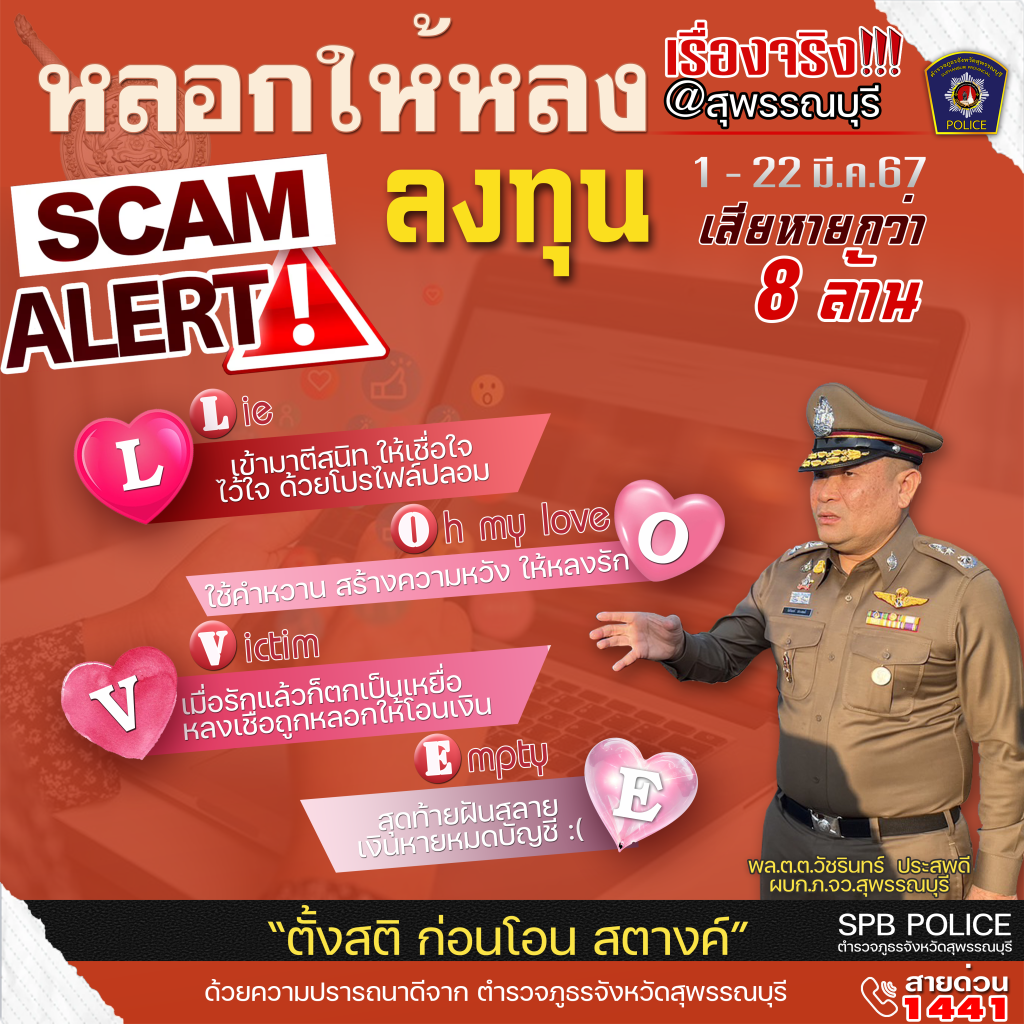 ระหว่างวันที่ 1 – 22 มีนาคม 2567 มีผู้เสียหายชาวสุพรรณ 6 ราย เสียหายกว่า 8 ล้าน (8,576,775 บาท)