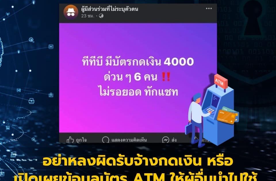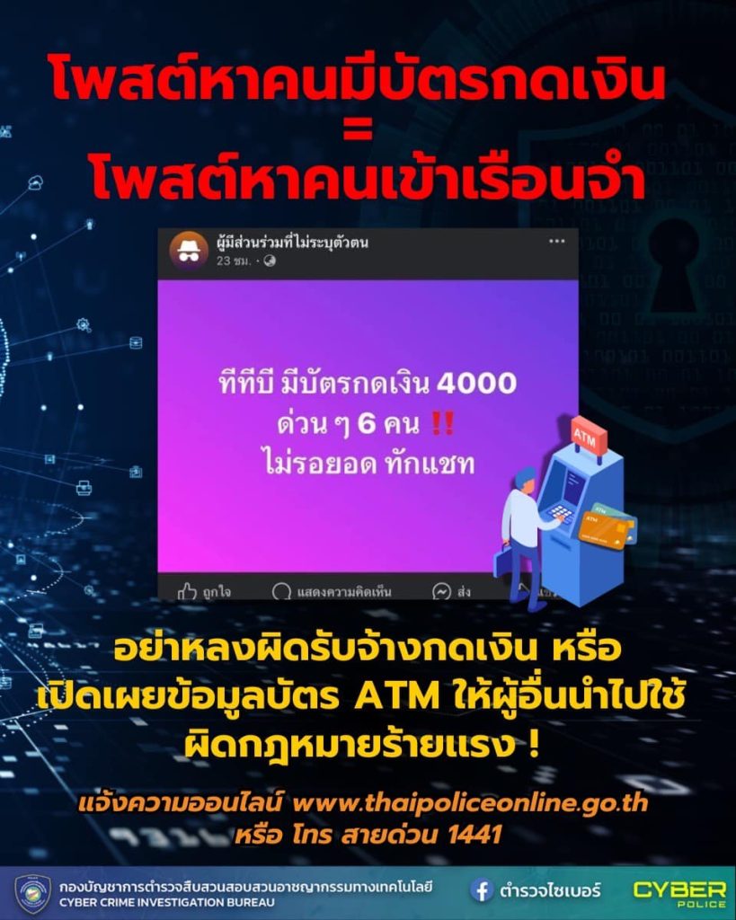 ปัจจุบัน มิจฉาชีพเริ่มเปลี่ยนเป้าหมายจากการจ้างเปิดบัญชีธนาคาร (บัญชีม้า) มาสู่ บัตร ATM มากขึ้น #อย่าหลงเชื่อ รับจ้างกดเงิน หรือเปิดเผยข้อมูลบัตร ATM ให้ผู้อื่นนำไปใช้ในการกระทำความผิด ซึ่งทำให้เรากลายเป็นผู้กระทำความผิด รับโทษทางกฎหมาย