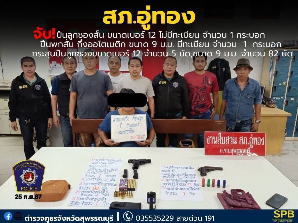 สภ.อู่ทองตรวจค้นจับกุมชายวัย 33 ปียึดปืนพกลูกซองสั้น ขนาดเบอร์ 12 ไม่มีเครื่องหมายทะเบียน จำนวน 1 กร