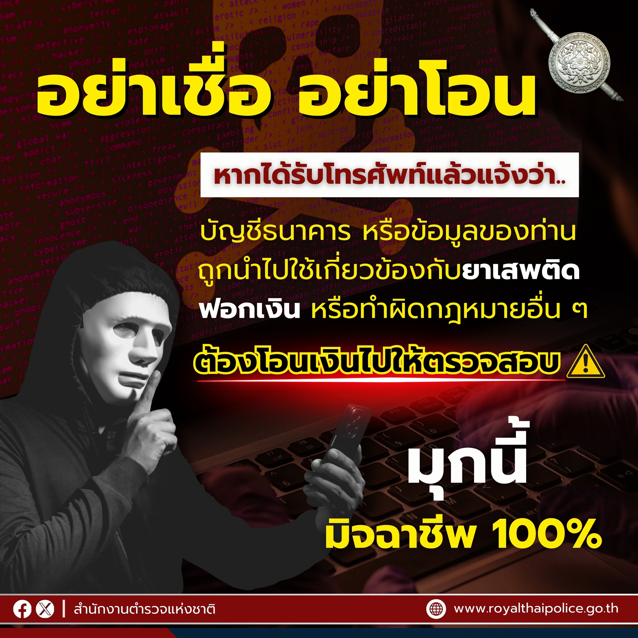 หากท่านได้รับโทรศัพท์อ้างตัวเป็นเจ้าหน้าที่หน่วยงานราชการ หรือธนาคารแจ้งว่าเงินในบัญชี หรือข้อมูลส่ว