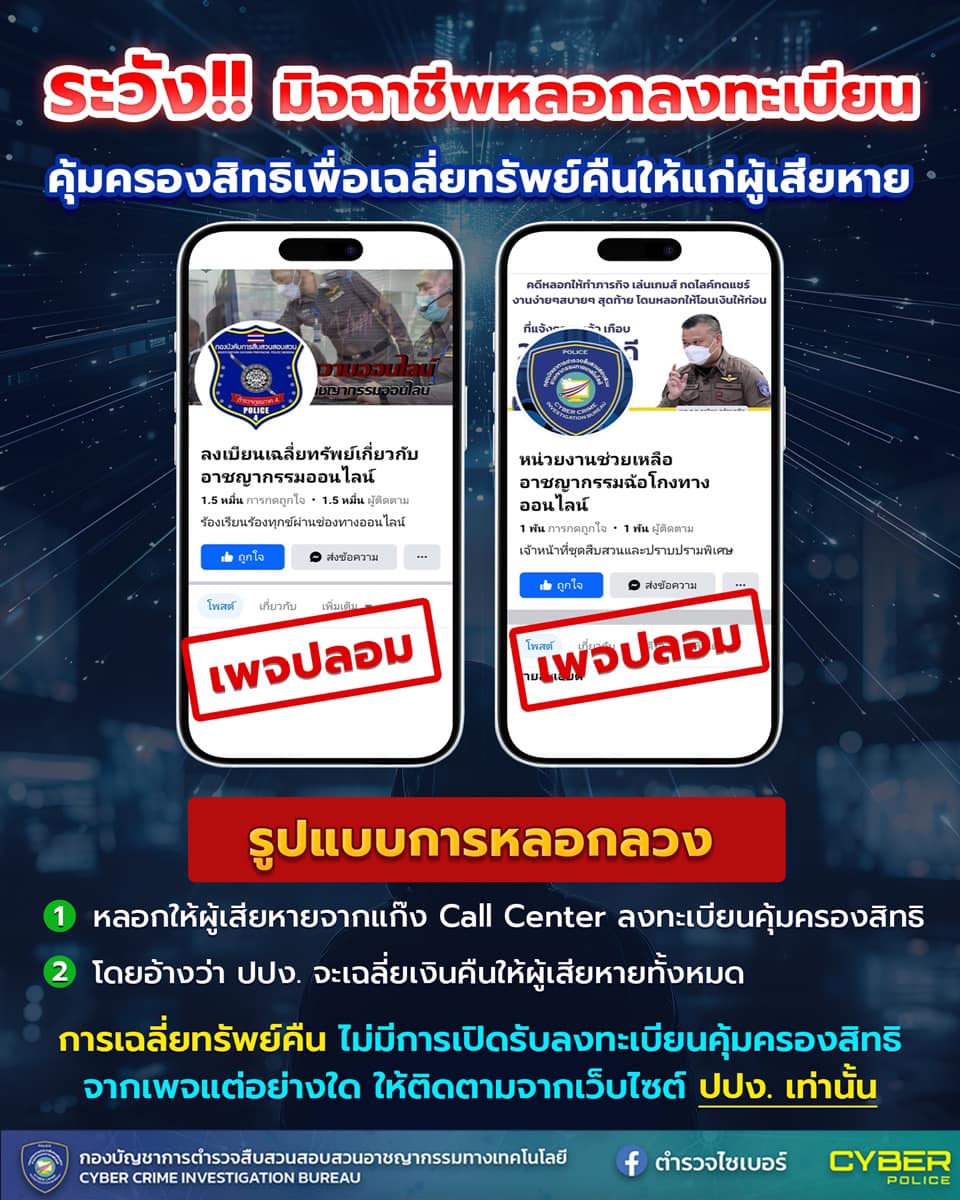 รูปแบบการหลอกลวง :1. มิจฉาชีพสร้างเพจปลอม หลอกให้ลงทะเบียนคุ้มครองสิทธิเพื่อเฉลี่ยทรัพย์คืนให้แก่ผู