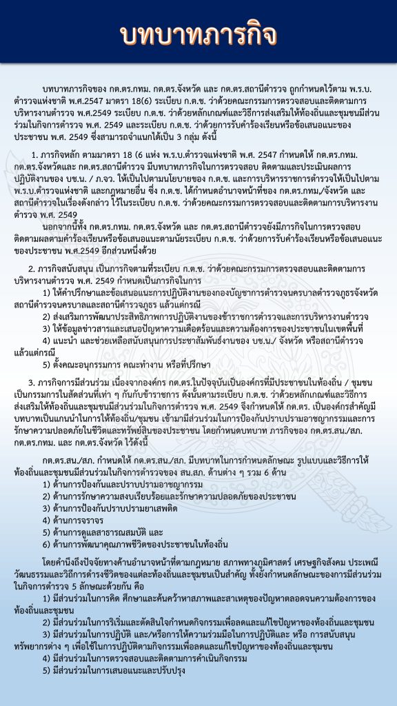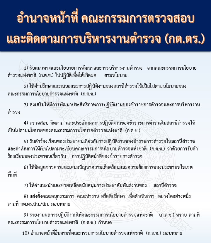 ที่มา: คู่มือการดำเนินการตำมระเบียบ ก.ต.ช. ว่าด้วยคณะกรรมการตรวจสอบและติดตามการบริหารงานตำรวจ พ.ศ. 2549